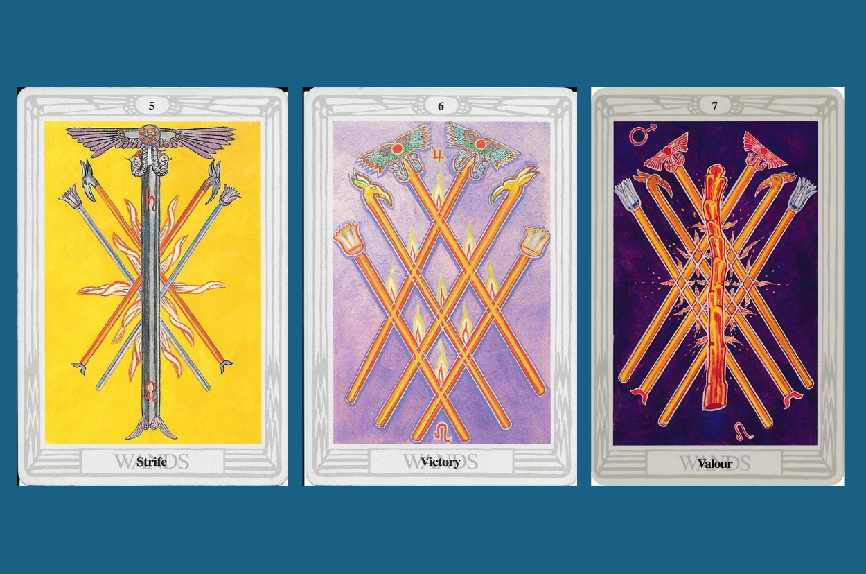 Let’s look at the tarot cards that are associated with this decan because I think it’s illustrative, not only to look at the Seven of Wands, which rules this decan, but also the Five and the Six, because we see the progression of that fire energy over the course of the sign.