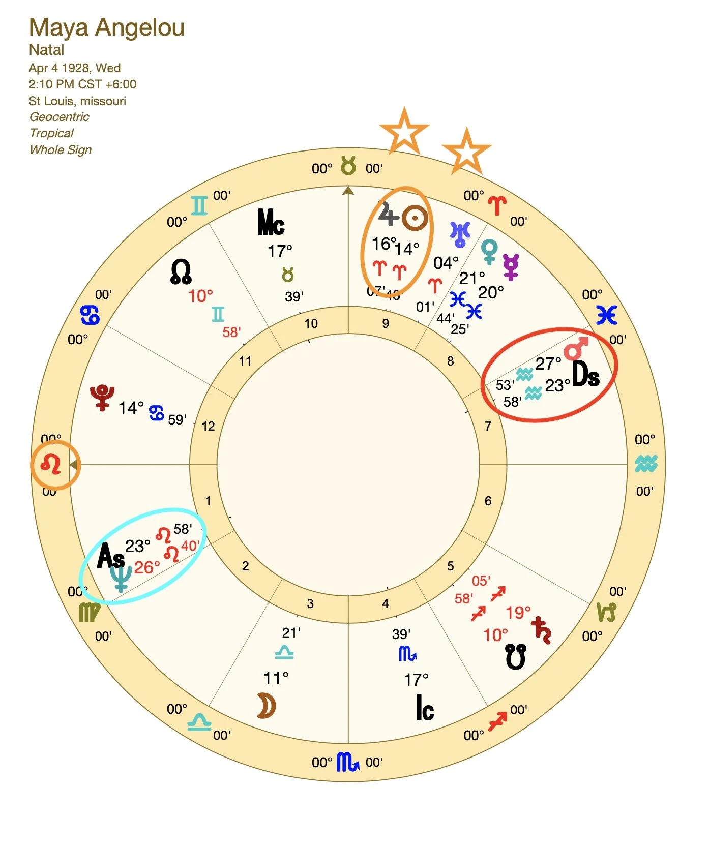 Mars on Maya Angelou’s descendant creates tension, difficulty, and the potential for her to experience suffering at the hands of others. When Mars opposes the ascendant, it can be challenging because the ascendant represents who we are.