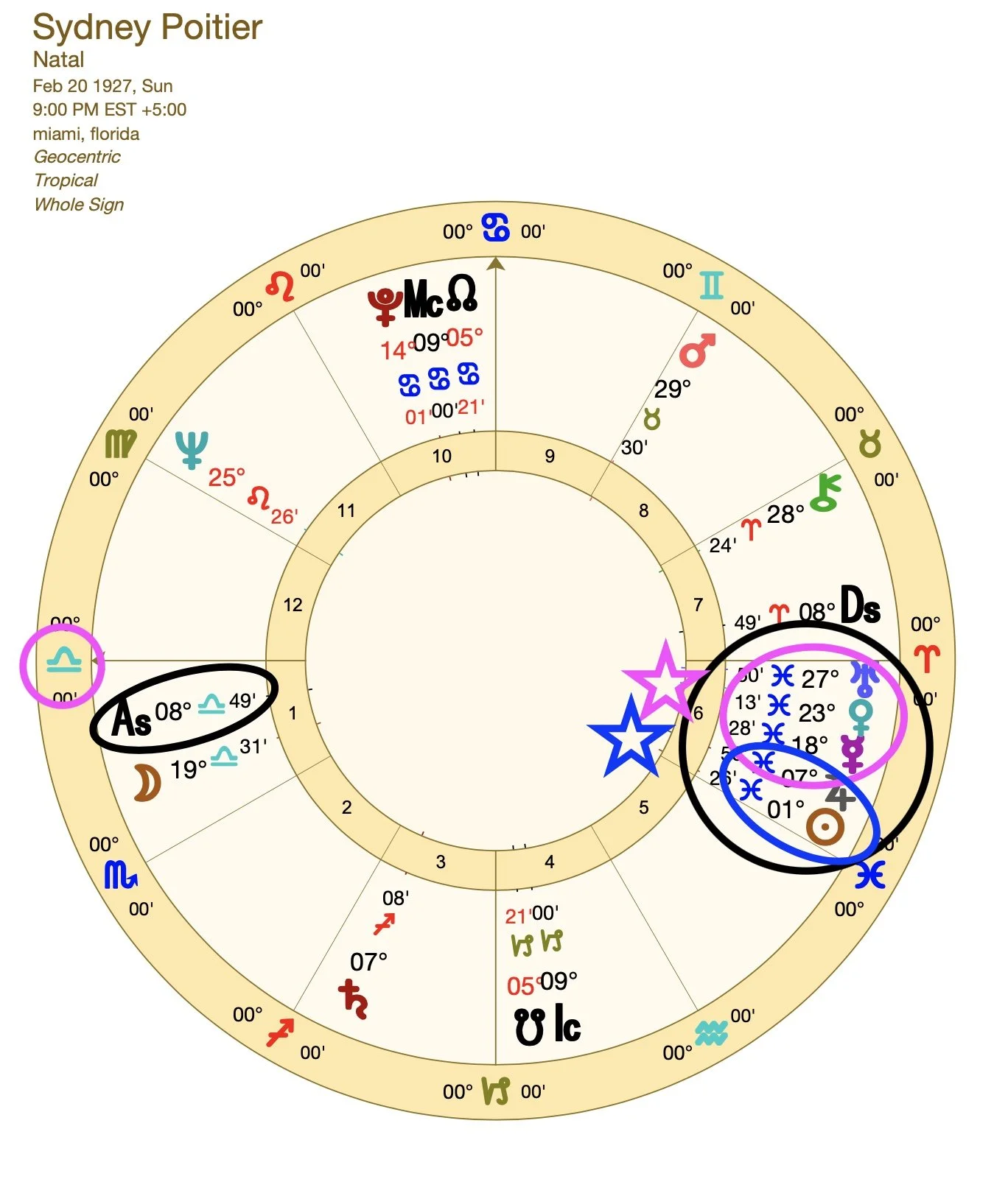 Astrologically, Poitier’s rising degree was at 8 degrees of Libra, making him a Libra Rising. This means Venus ruled his chart and guided his life purpose or Dharma. His Venus was exalted in Pisces, giving it extra power and influence, despite being placed in the sixth house—a house often associated with service and powerlessness. As a Black man and actor facing systemic racism, Poitier knew what it meant to lack power. Yet, he found extraordinary roles that awakened public consciousness, a testament to his powerful Venus.