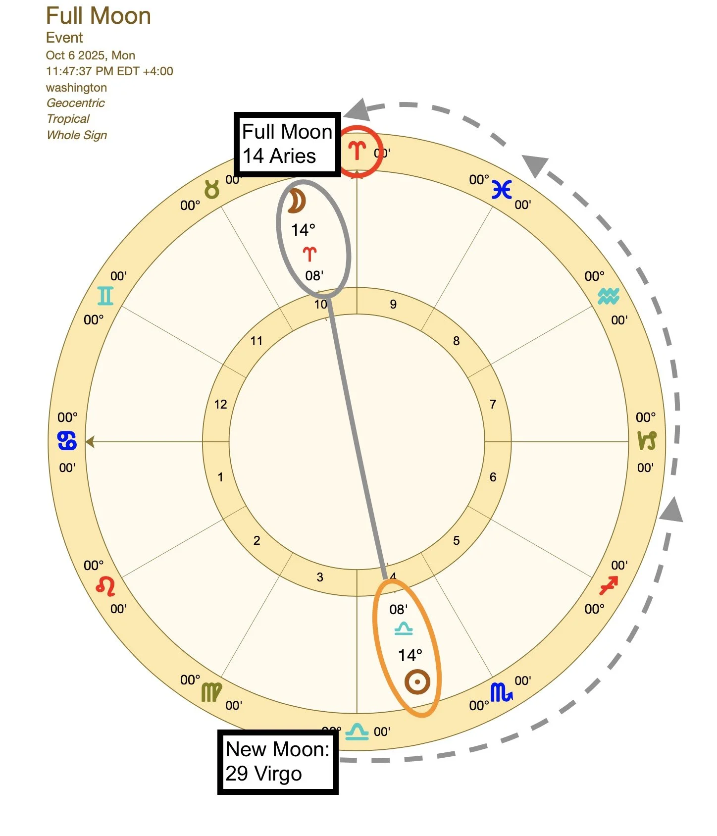 Again, I want to take a moment to teach you step by step where I get the information I’m sharing. First of all, we start with the fact that this is a Full Moon. A Full Moon occurs about two weeks after a New Moon.