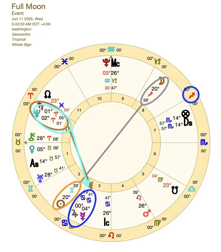 Now, at the full moon, we’re in the challenging last decan of Sagittarius. This phase asks us to be responsible and realistic about what we can and cannot accomplish. In this full moon chart, in addition to the moon being in the last 10 degrees of Sagittarius, we still see Saturn and Neptune at the beginning of Aries. They’re in a square to Jupiter, which has entered Cancer, and Mercury. Jupiter rules this lunation because it rules Sagittarius.