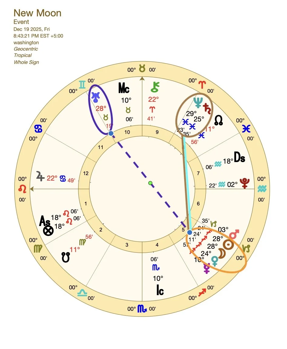 The New Moon chart also carries a strong pattern: Saturn and Neptune square the New Moon from Pisces, which can bring uncertainty, doubt, or the sense that something needs to be adjusted before it makes sense. Uranus forms an inconjunct, adding sudden changes or shifts in direction. These influences can create pressure, but they also help us sort out what’s real, what’s possible, and what needs to be reworked. Sagittarius III, the decan of the 10 of Wands, highlights effort, endurance, and the point where we recognize what we’re carrying and what we might need to set down.