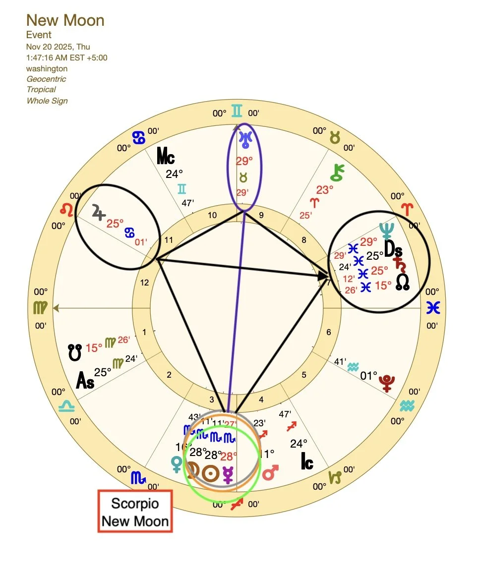 As we move into the discussion about rising signs later, it’s worth remembering that this New Moon might connect you to grapple with questions around your desires, illusions that may arise about what matters to you, and sudden insights on where you may need to let go of a desire that no longer serves you. There could be a shake‑up—maybe you move toward something, and then circumstances change, or it falls away, or you realize you have to let it go. That letting‑go process is central to Scorpio’s lessons. Scorpio tends to hold on, but one of its main tasks involves release—facing endings, transitions, and rebirth. That may be what comes up for many of us around this New Moon.