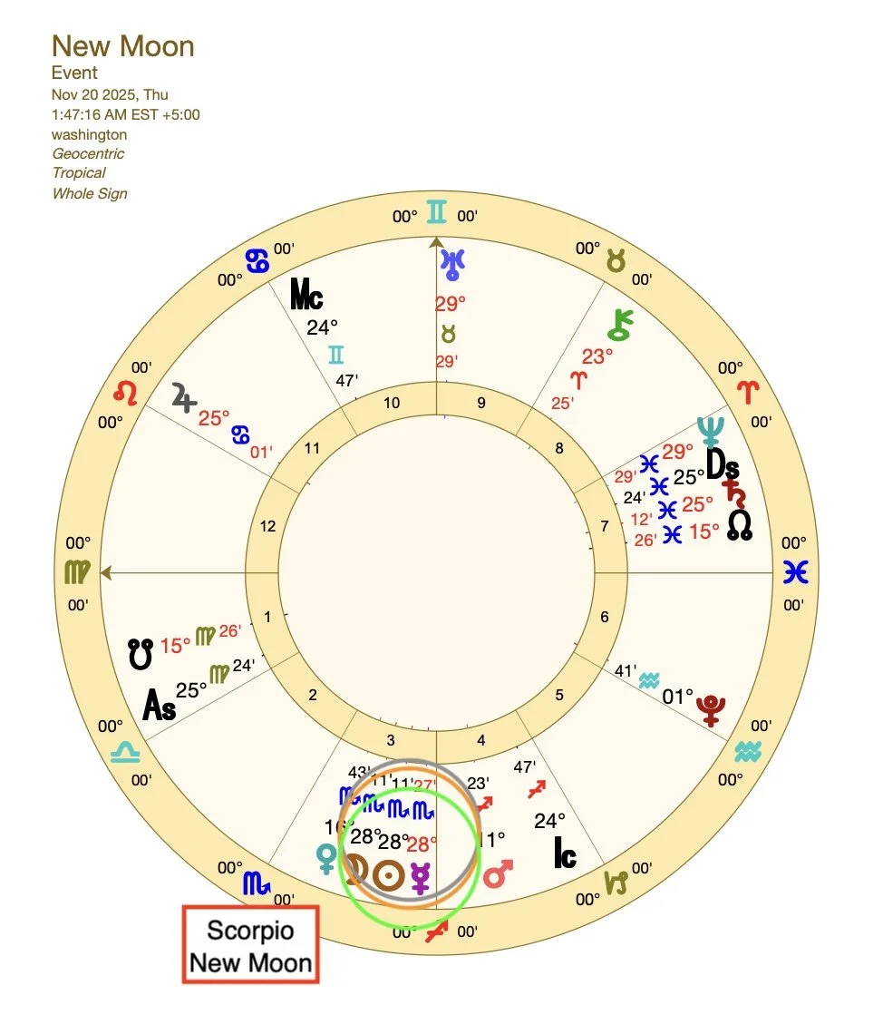 The Scorpio New Moon on November 20 invites us to slow down and look beneath the surface. Scorpio is a water sign that deals with truth, depth, and transformation—it helps us release what’s no longer working and reconnect with what matters most. This New Moon is a time to notice what you’re holding onto and whether it’s time to let go. Because Scorpio is ruled by Mars, there’s determination here too—the strength to stay present and move through change with purpose. You can watch my full talk about this New Moon, including what it means for all twelve rising signs, in the video below. If you do not know your rising sign, check out my YouTube video on how to pull up your Birth Chart on astro.seek.com.