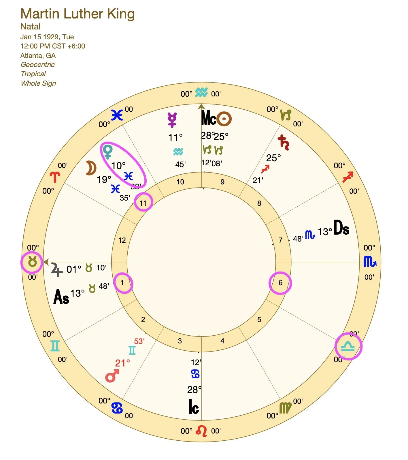 For example, in Martin Luther King Jr.’s chart, Venus is in his 11th house in Pisces. Venus is responsible for first-house topics because Venus rules Taurus, which is on the cusp of his first house. Venus also rules sixth-house topics because Libra is on the cusp of his sixth house.