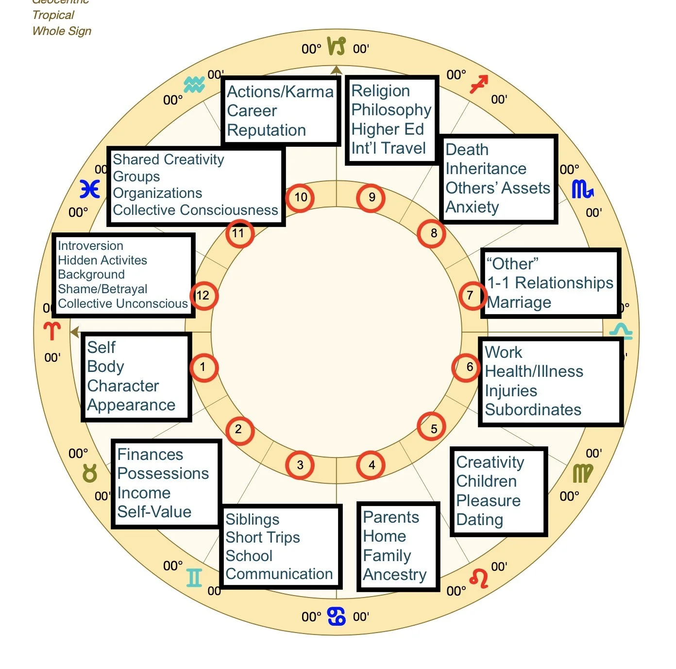 We’ll put up a chart in a second showing the topics of each of the 12 houses, as not everyone has them memorized.