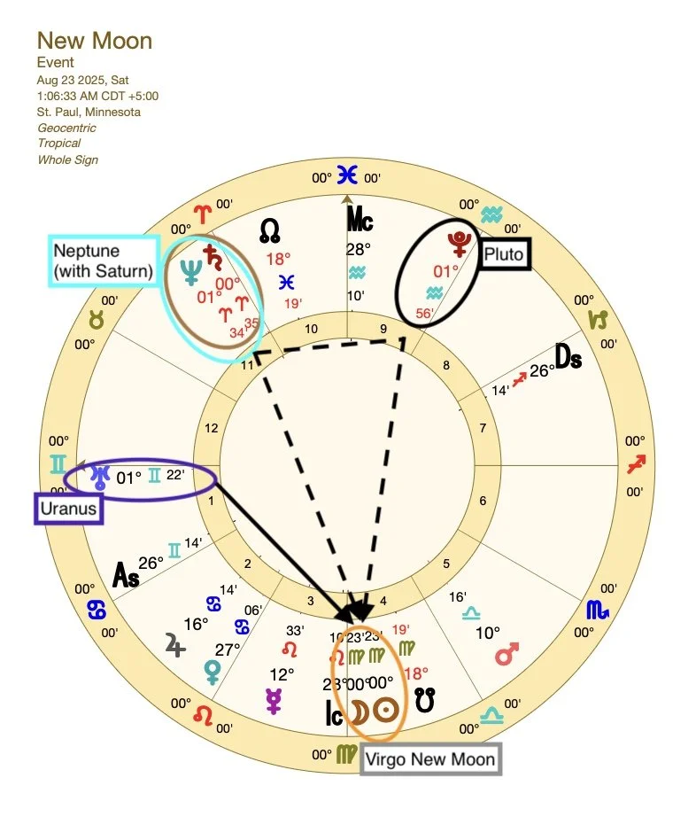 A major theme of this New Moon is the interplay between Uranus’s disruptive energy and Virgo’s focus on careful, deliberate work. If you’ve been refining a project or working toward a goal, Uranus may shake things up, offering unexpected insights or forcing you to adapt. This lunation also features a Yod aspect, sometimes called a “Finger of God,” involving Pluto and Neptune. This configuration can feel like unconscious pressure pushing you toward a fated shift or a deeper alignment with your purpose.