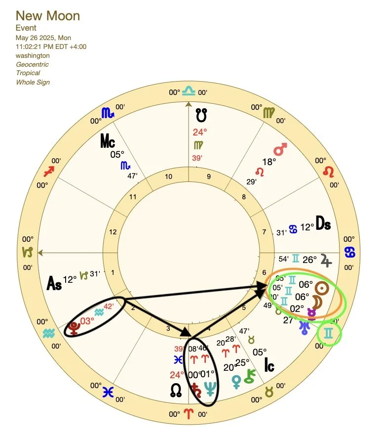 This New Moon occurs at 6 degrees of Gemini, which means it will especially impact those with planets or points near 6 degrees of the Mutable Signs (Gemini, Virgo, Sagittarius, and Pisces). If you have key placements at or near these degrees, you may feel the influence of this lunation more strongly, particularly in areas related to communication, learning, and mindset.